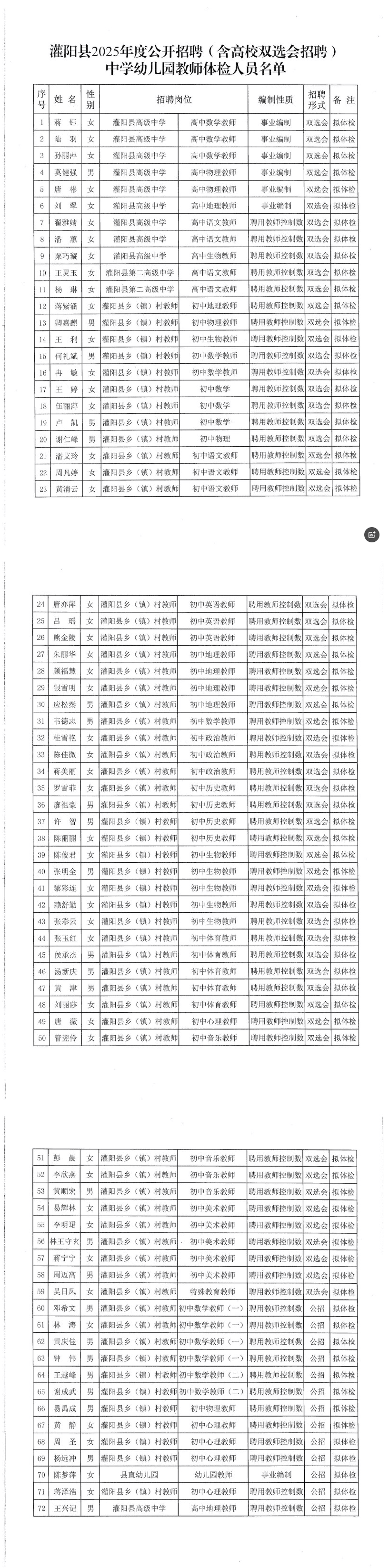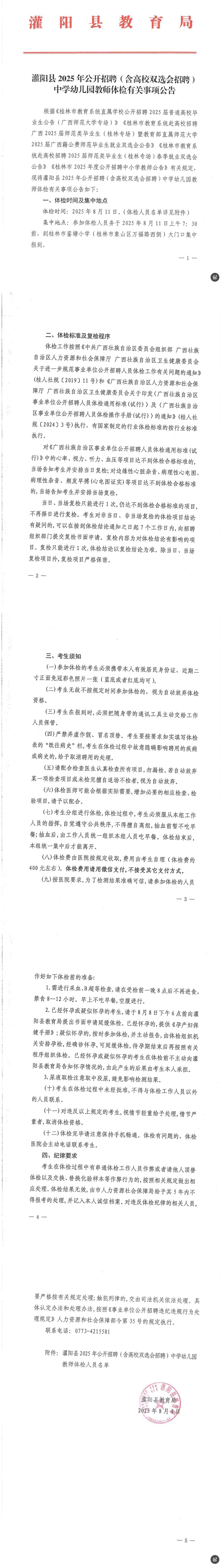 灌陽縣2025年公開招聘(含高校雙選會招聘)中學幼兒園教師體檢有關事項公告