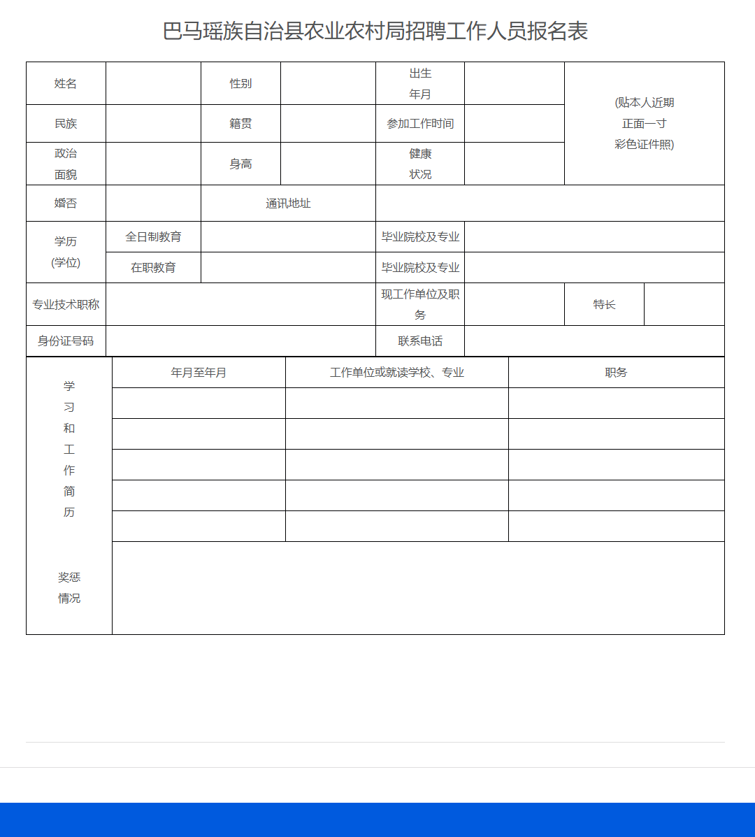 (1)《巴馬瑤族自治縣農(nóng)業(yè)農(nóng)村局招聘工作人員報名表》1份(詳見附件);