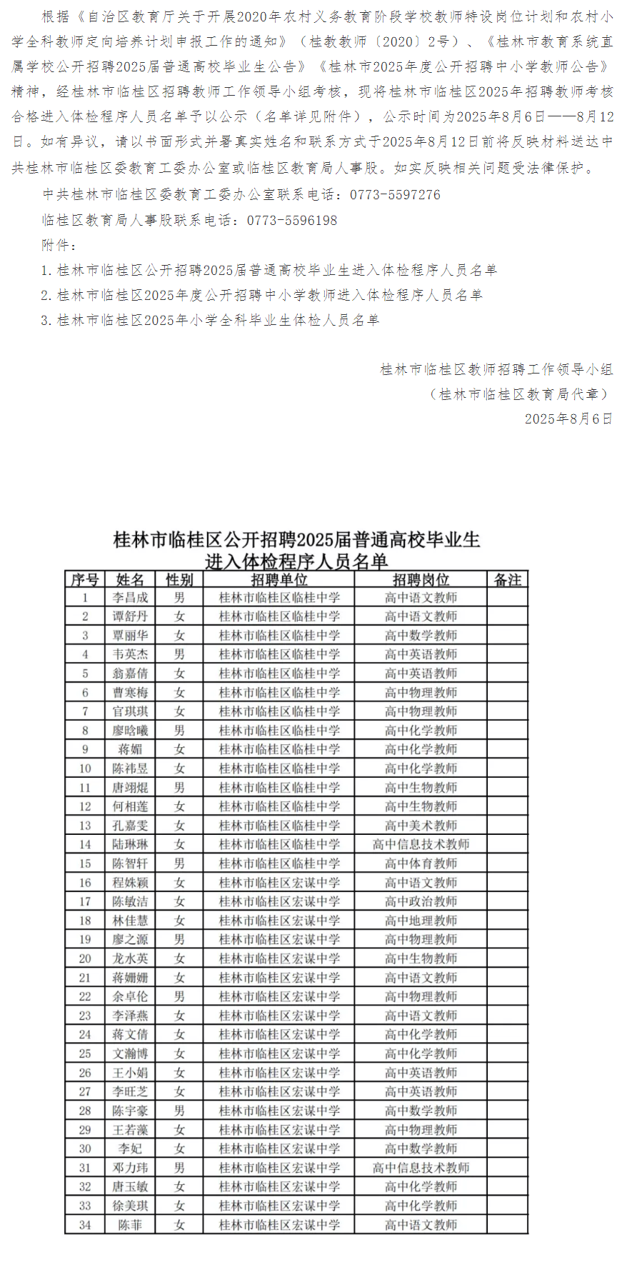 桂林市臨桂區(qū)2025年招聘教師考核合格進(jìn)入體檢程序人員名單公示