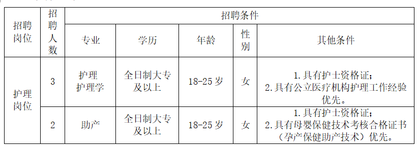 本次公開招聘護理崗位工作人員5名,具體招聘崗位、人數、資格條件如下: