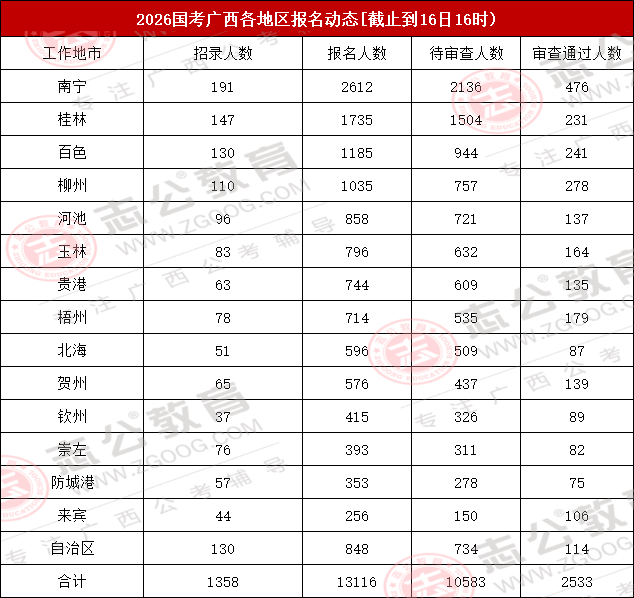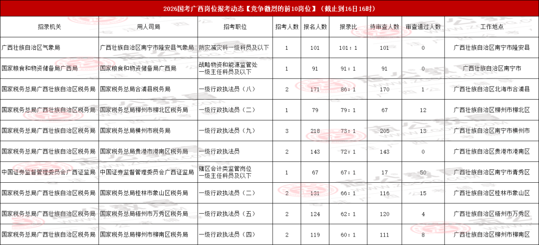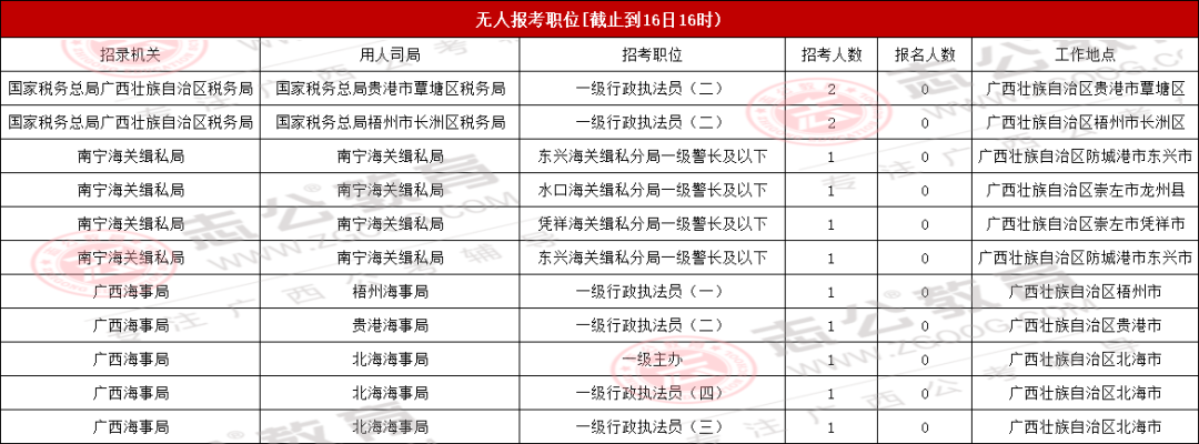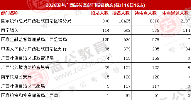 今天是報名第二天,小伙伴可要抓住此次上/岸機會啦!來看看廣西今天的報名數(shù)據(jù)吧。截止10月16日下午16:00,已經(jīng)有13116名考生報名,最熱崗220人報名!從各項數(shù)據(jù)來看,部分考生可能還持觀望態(tài)度。在接下來的報名時間里,可能會迎來報名人數(shù)大幅增長的情況,大家可以密切關注。