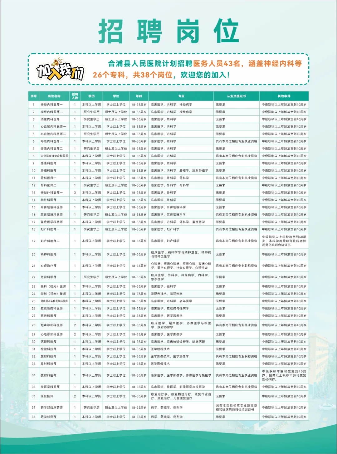 信息發(fā)布: 招聘過程中的重要通知將在微信公眾號“廣西合浦縣人民醫(yī)院”“合浦縣人民醫(yī)院”及醫(yī)院官網(wǎng)發(fā)布,請應(yīng)聘人員密切關(guān)注。