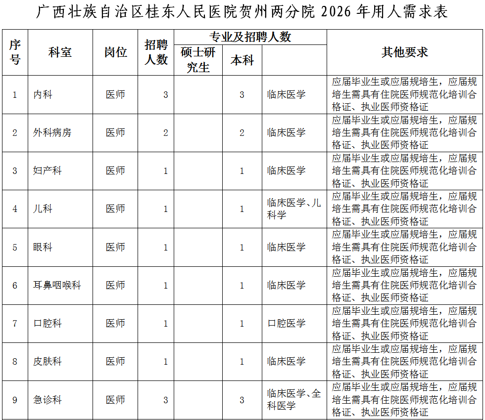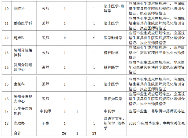 (應(yīng)聘報(bào)名二維碼)同時(shí),按以下要求提供個(gè)人應(yīng)聘材料(電子版)發(fā)電子郵箱:gdyy2817726@163.com(郵件主題請(qǐng)標(biāo)明:“姓名+賀州兩分院”字樣)。應(yīng)屆畢業(yè)生:個(gè)人簡(jiǎn)歷、身份證、就業(yè)推薦表、成績(jī)單、各種獎(jiǎng)項(xiàng)獎(jiǎng)勵(lì)證書(shū)、外語(yǔ)等級(jí)證書(shū)等。非應(yīng)屆畢業(yè)生:個(gè)人簡(jiǎn)歷、身份證、畢業(yè)證、畢業(yè)證備案登記表、學(xué)位證、學(xué)位證備案登記表、職稱(chēng)證、執(zhí)業(yè)證、住院醫(yī)師規(guī)范化培訓(xùn)合格證、工作證明等。報(bào)名時(shí)所提交的申請(qǐng)材料必須真實(shí)、準(zhǔn)確,因報(bào)名時(shí)提交的申請(qǐng)材料不真實(shí)、不完整或錯(cuò)誤填寫(xiě)報(bào)名信息,造成資格審查、面試資格審查不通過(guò)的,后果由報(bào)名人員自行承擔(dān)。(2)資格審核。人事科依據(jù)招聘公告和用人需求規(guī)定的資格條件對(duì)應(yīng)聘人員簡(jiǎn)歷進(jìn)行收集和資格初步審查,經(jīng)招聘工作領(lǐng)導(dǎo)小組審核后,確定符合崗位條件報(bào)名人員名單,由醫(yī)院人事科電話或短信通知符合條件人員。(3)考核。考核筆試和面試由人事科負(fù)責(zé)組織實(shí)施,協(xié)助部門(mén)為醫(yī)務(wù)部、護(hù)理部、科教科以及用人科室,紀(jì)律監(jiān)督部門(mén)為監(jiān)察室。逾期未參加則視為自愿放棄。(4)試工。通過(guò)考核的非應(yīng)屆畢業(yè)應(yīng)聘人員,須到醫(yī)院試工5天。試工不通過(guò),不予聘用。(5)體檢。體檢工作由廣西壯族自治區(qū)桂東人民醫(yī)院按照有關(guān)規(guī)定統(tǒng)一組織。體檢標(biāo)準(zhǔn)參照《廣西壯族自治區(qū)事業(yè)單位公開(kāi)招聘人員體檢通用標(biāo)準(zhǔn)(試行)》《廣西壯族自治區(qū)事業(yè)單位公開(kāi)招聘人員體檢操作手冊(cè)(試行)》執(zhí)行。體檢不合格或隱瞞真實(shí)情況致使體檢結(jié)果失真的,不予聘用。因體檢不合格空缺崗位的,將按考核的綜合成績(jī),從高到低,順位補(bǔ)充體檢人員。(6)公示和聘用。對(duì)擬聘非應(yīng)屆畢業(yè)應(yīng)聘者在全院范圍內(nèi)進(jìn)行公示,公示期為5個(gè)工作日,公示期滿(mǎn)無(wú)異議按程序辦理聘用手續(xù)。對(duì)公示有異議,經(jīng)核實(shí)影響聘用的,取消其聘用資格;對(duì)反映問(wèn)題難以核實(shí)的暫緩聘用,待核實(shí)清楚后按有關(guān)規(guī)定辦理。