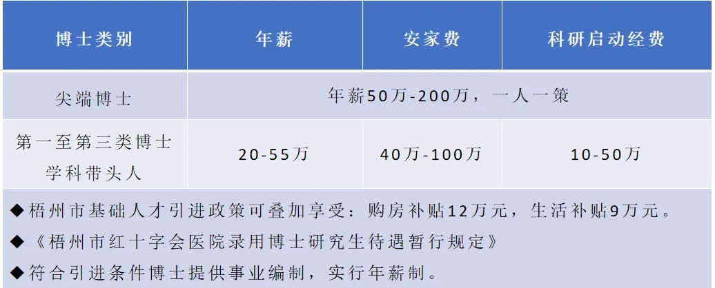博士研究生學(xué)歷學(xué)位的急需緊缺專業(yè)人才:享受醫(yī)院引進博士待遇20-200萬元/年,實行年薪制待遇一人一議,提供科研啟動經(jīng)費10萬-50萬元,疊加享受梧州市人才引進補助,安家費52-125萬元,生活補貼9-12萬元。