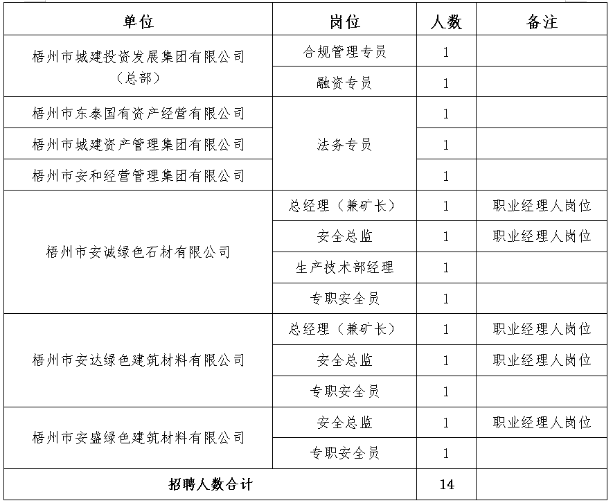 崗位要求詳見(jiàn)《梧州市城投集團(tuán)招聘計(jì)劃表》(附件1)。