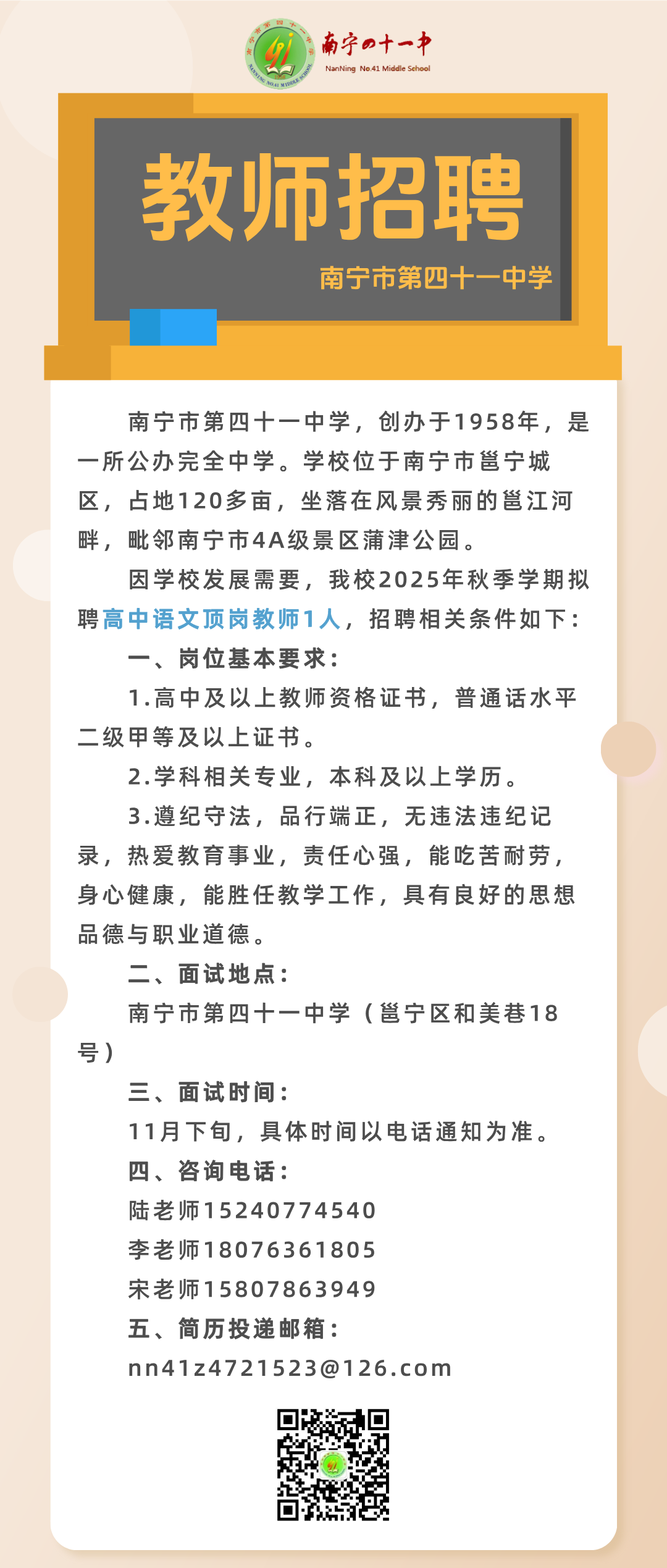 原文標題:2025年秋季學期南寧市第四十一中學關于公開招聘頂崗教師的啟事